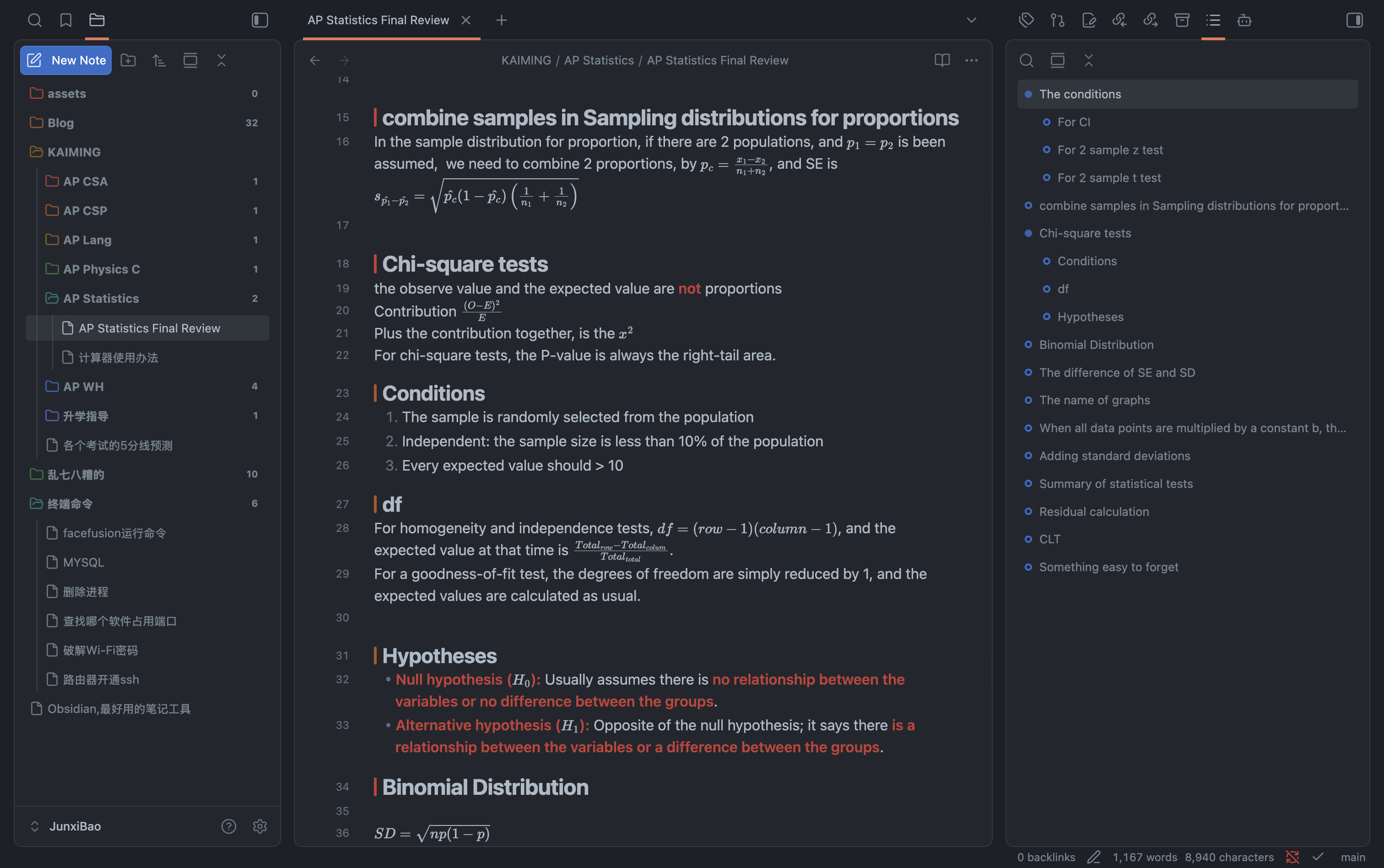 First, Markdown itself supports LaTeX formulas. This means I can directly type formula code inside my notes and let Obsidian render it beautifully. For anyone who frequently records math-related content, this is already extremely useful.
